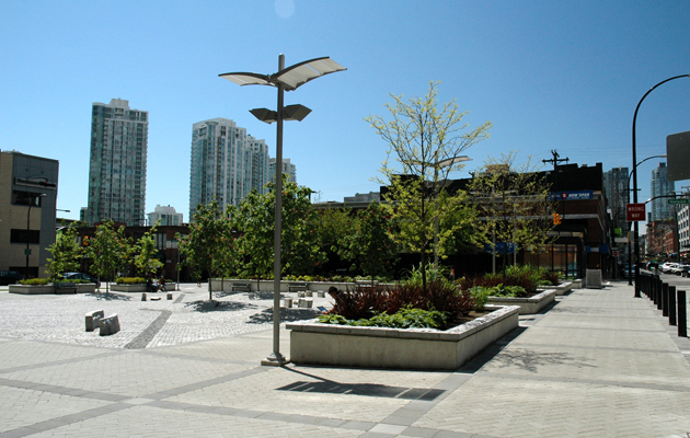 Its paved square is defined by planting on all 4 sides. Double rows of trees on Mainland and Nelson Streets together with lush textured planting draws from nearby residential tower gardens. The central granite cobble area is planted with large flowering shade trees. Situated amongst these trees are heritage granite curb pieces set pointing towards orthagonal north. Metal screens with vines climbing up them along Nelson street pick up on the steel canopies of the old warehouses. Yaletown Park is a vibrant urban space. A place to shop for veggies at the Saturday Yaletown Farmers Market or a place to meet friends and have a cup of coffee. The north loading dock and wide canopy offers an outdoor cafe and retail/office space.